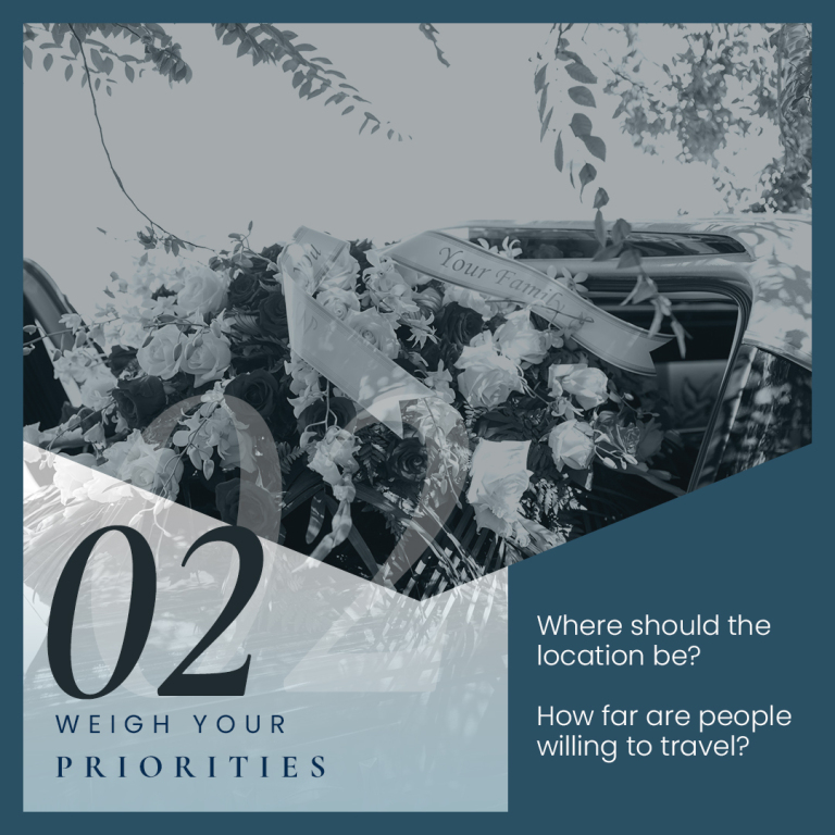 What are the most important priorities? Convenience of location? Proximity to a place of worship? Special religious or cultural requirements? Be aware that most funeral homes will travel 20 to 30 miles to pick up the deceased without charging extra; this may be a consideration, where you choose to drive 15 extra minutes instead of paying hundreds of dollars more for the services.